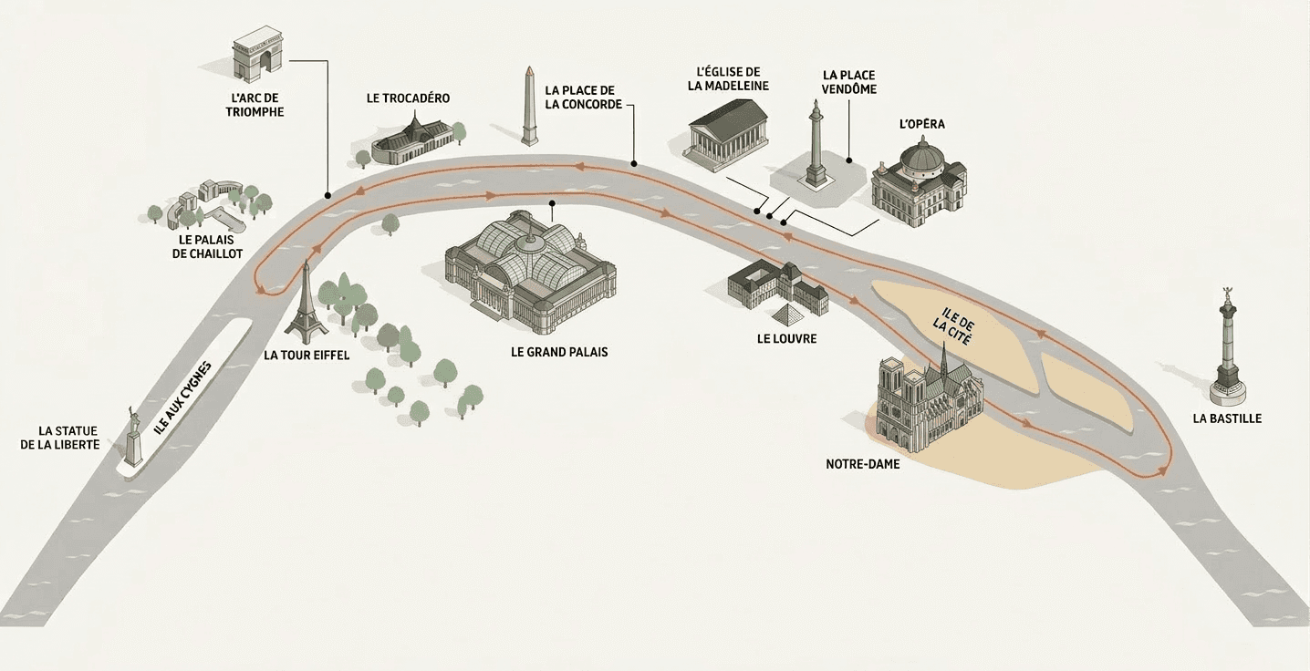 Le circuit est un parcours d’environ 25 km de la Gare de Javel jusqu’à la bastille.